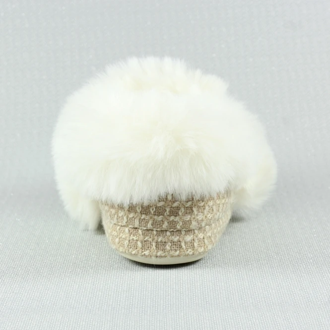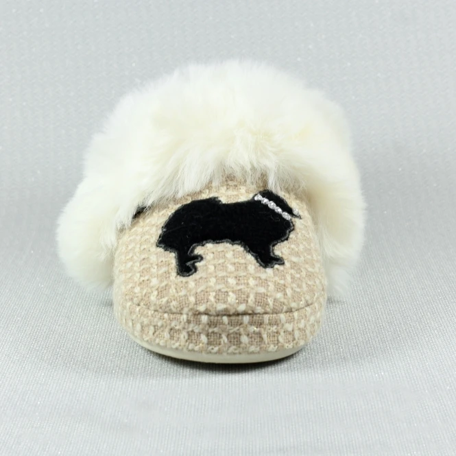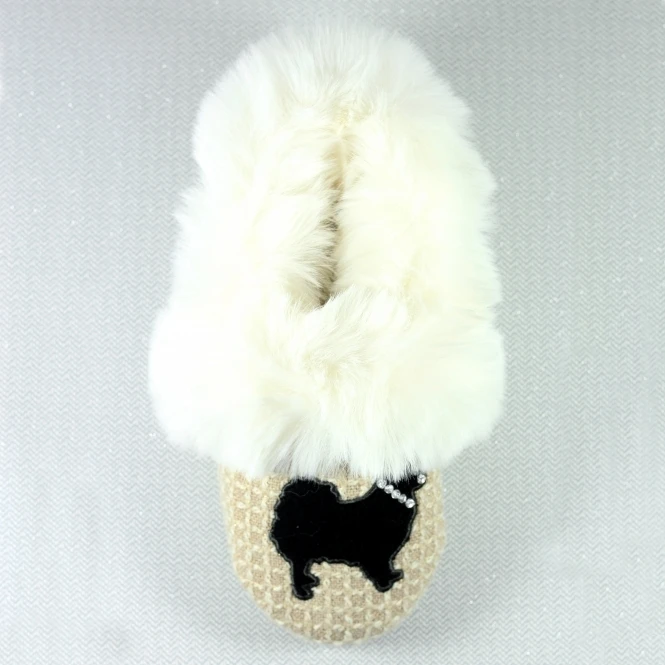 The Cookie, a stunning full slipper, perfect for all the doggy lovers, especially those with a love for ‘poms’. The coffee and cream, waffle effect upper is the perfect background for the Pomeranian motif, complete with diamante collar. The slipper features a padded insole, is fully faux fur lined and finished with a super fluffy, faux fur trim. Ultimate luxury.