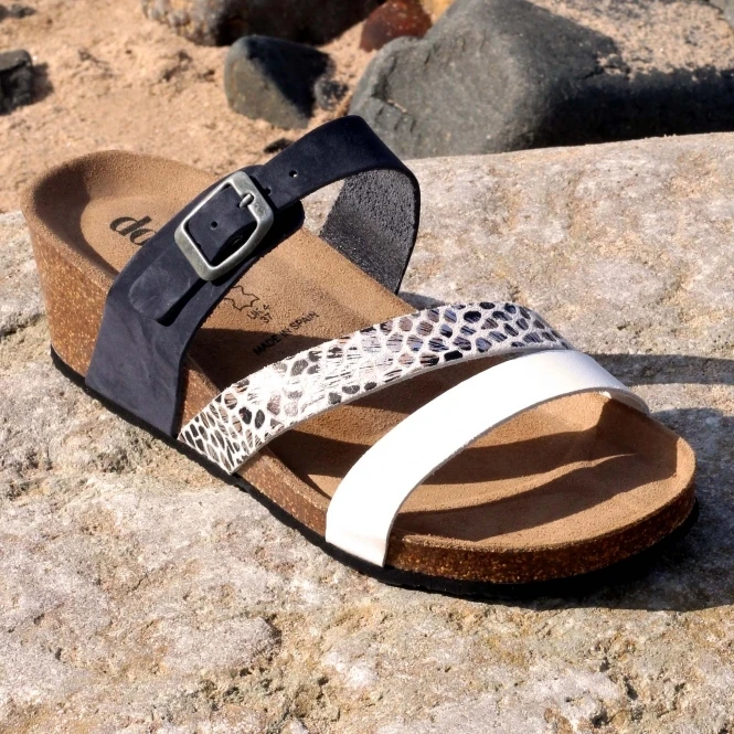 Introducing our stylish Camber sandal, expertly crafted from high-quality leather in a beautiful combination of blue, snake print, and white.These sandals are perfect for those looking to add a touch of sophistication to their summer wardrobe. The blue leather strap adds a pop of color, while the metallic snake print strap gives a subtle shimmer to the overall design. The white strap completes the overall look of the sandal. The wedge heel offers both style and comfort, providing a subtle lift while still maintaining stability. Whether you’re heading out for a casual day at the beach or dressing up for a night out on the town, our wedge sandals are the perfect addition to any outfit.