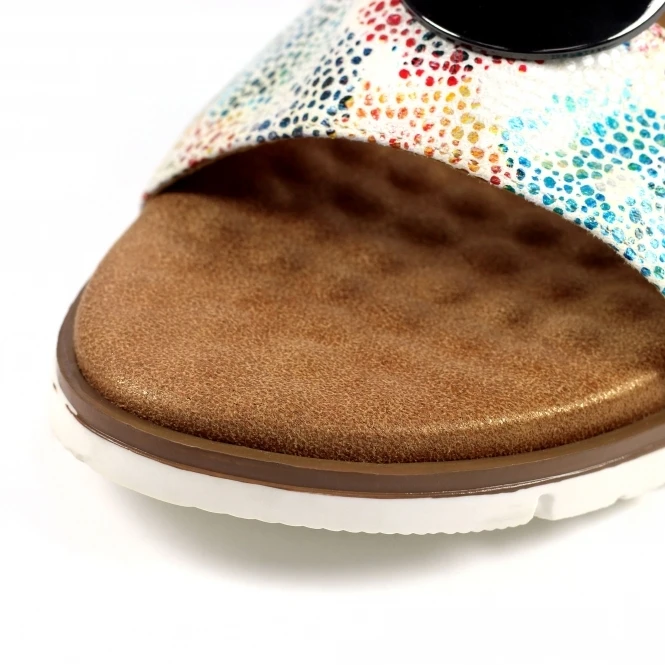 Introducing our stunning Alibi sandal, designed for both style and comfort. With two sturdy upper straps featuring a striking multicolored snake print and elegant black brooch detail, these sandals are the perfect addition to any outfit. The cushioned insole ensures maximum comfort with every step, making them ideal for all-day wear. Don’t miss out on these fashionable and functional sandals!