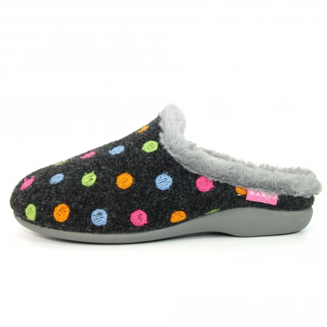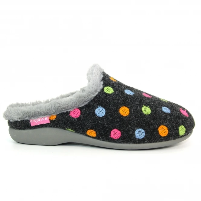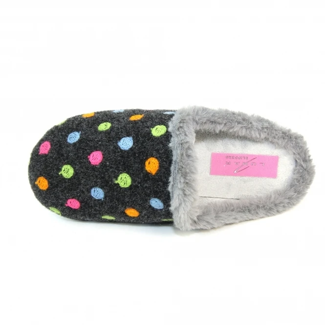 Bernice is a mule slipper with multi-colored polka dots on the upper, this brings a wonderful light and airy feel to the slipper. The embroidered polka dots are enough to brighten anyone’s day in Green’s, Oranges, and Blue.