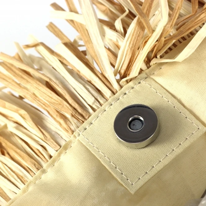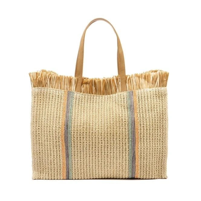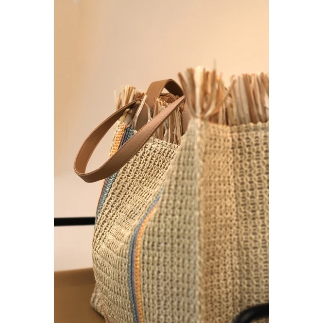 The Garda, a large woven beach bag tote with tan, faux leather straps and multi coloured (with subtle sparkle) stripes. Fully lined with magnetic stud fastening and an inner patch pocket compartment. The fringed top adds to the boho vibe, perfect for the beach or pool.