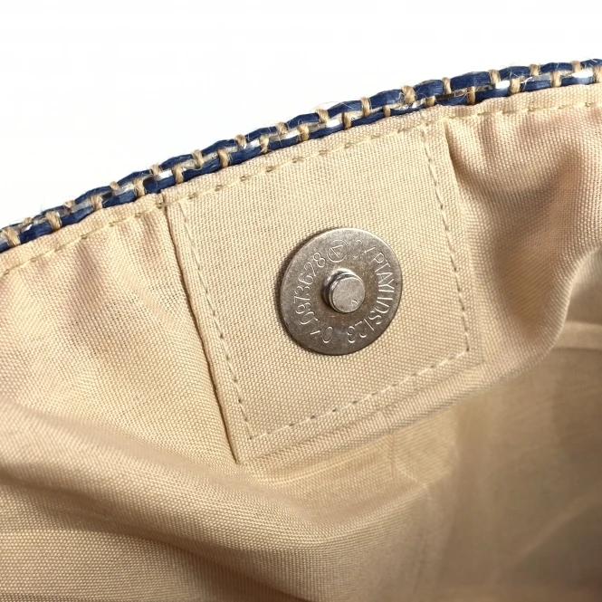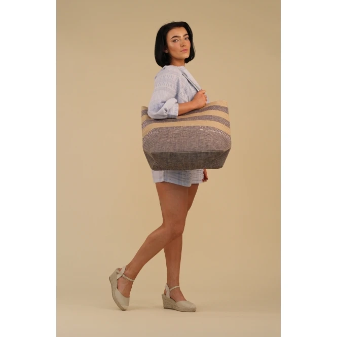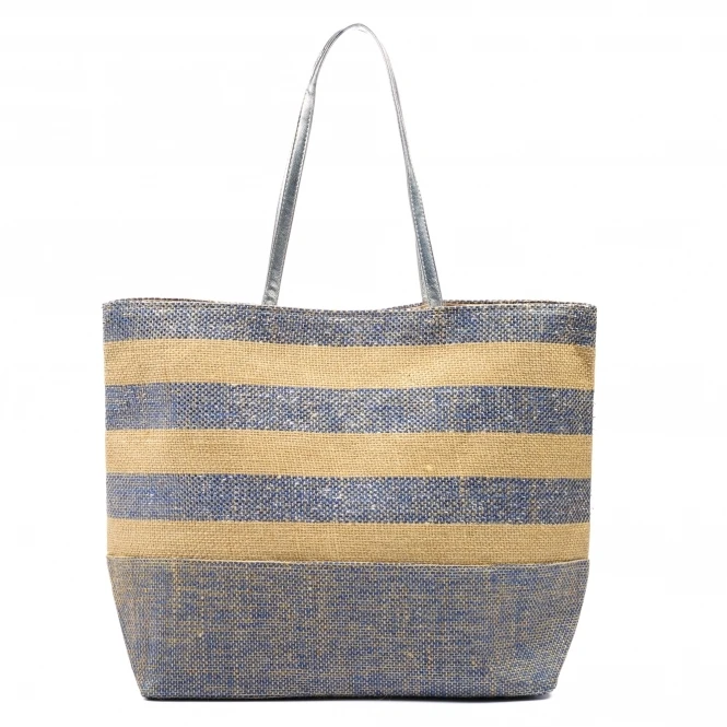 The Nisha, a large woven beach bag with a nautical theme featuring metallic blue and natural jute stripes with silver faux leather handles. Fully lined with with magnetic stud fastening and an inner patch pocket compartment. This bag oozes style.