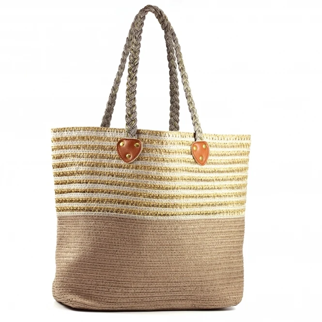 The Saville, a large woven beach tote bag with two tone metallic strips to the upper and solid colour to the lower with decorative plaited straps. Fully lined with magnetic stud fastening and inner patch packet compartment. The metallic detailing gives serious summer vibes, perfect for the beach or pool.