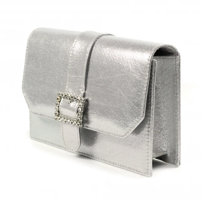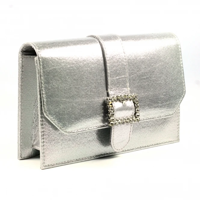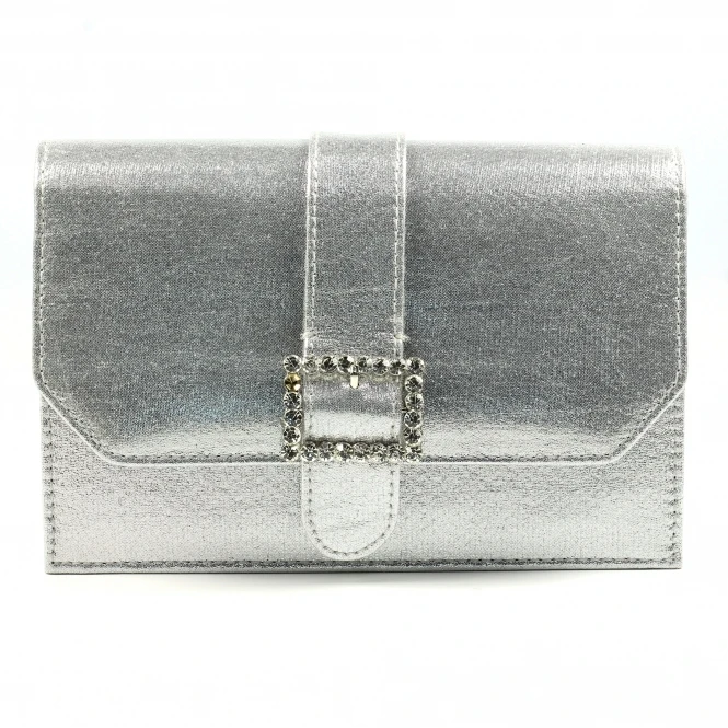 The Trixabel clutch, perfect to complete any outfit when wearing your beautiful Trixabel sandals. It features the same metallic finish as well as the matching gemstone encrusted faux buckle as the sandals.